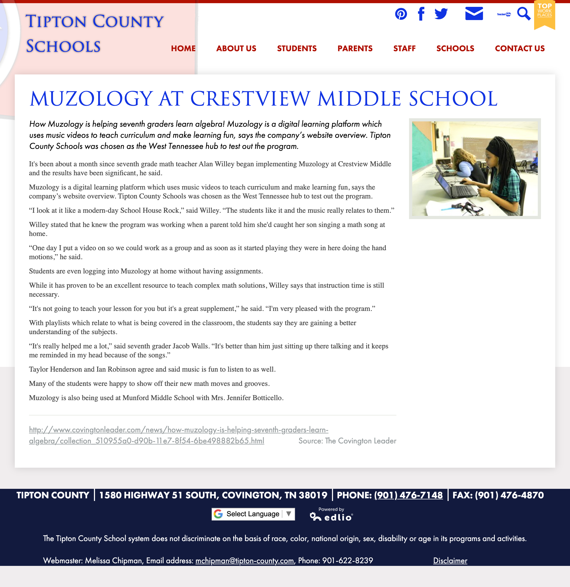 How Muzology is helping seventh graders learn algebra! Muzology is a digital learning platform which uses music videos to teach curriculum and make learning fun, says the company’s website overview. Tipton County Schools was chosen as the West Tennessee hub to test out the program.